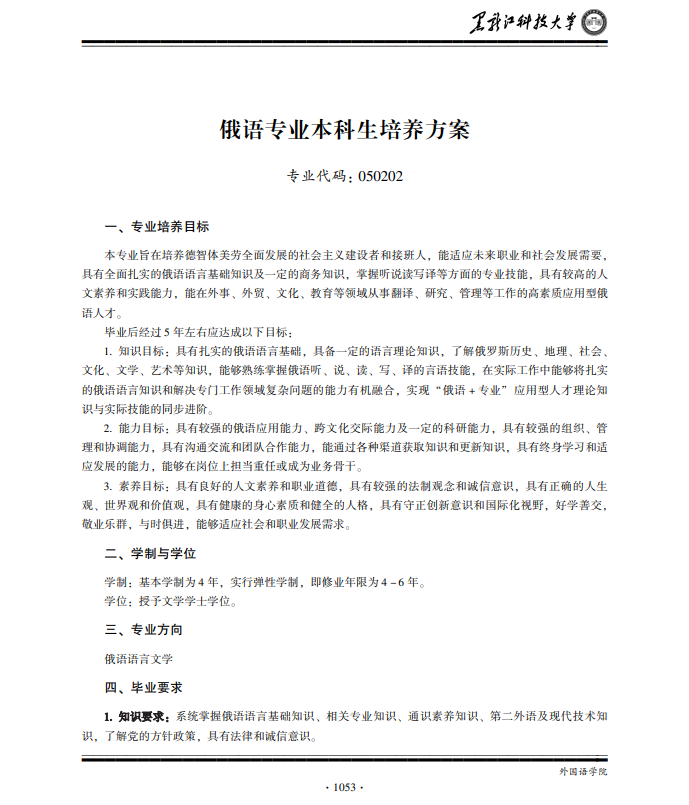 俄语专业本科生人才培养方案(2022版)